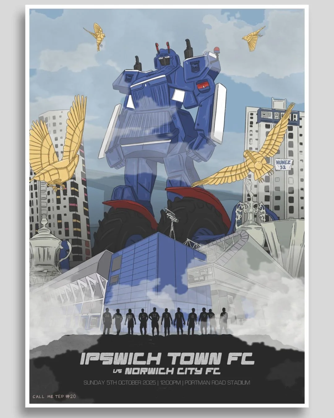 Sam Peet’s design captures the excitement of fans making their way to Portman Road on matchday, skillfully using the same pallete he deployed for last season’s Leicester poster.